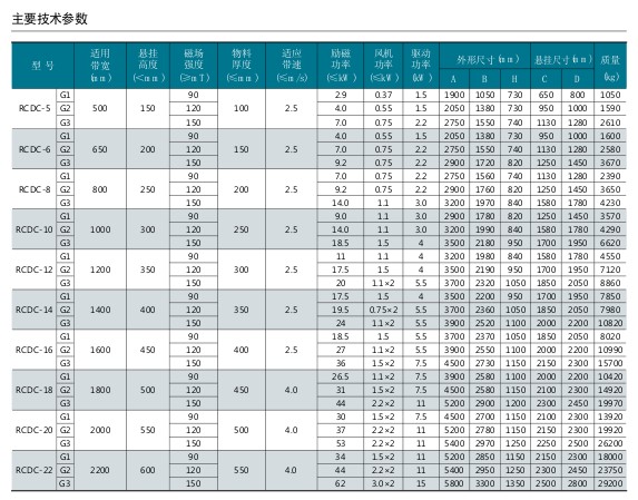 RCDC系列風冷帶式電磁除鐵器,是在RCDA系列風冷式電磁除鐵器的基礎上增加了驅動電機、滾筒、臺架、帶刮板的卸鐵膠帶等組成的卸鐵機構。在工作過程中卸鐵機構自動將卸鐵皮帶上吸附的鐵磁性物質拋到除鐵器以外的集鐵箱內(nèi),無需停電人工清理,實現(xiàn)了除鐵自動化。